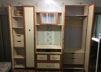 В отличном состоянии шкаф-стенка, 4 элемента: платяной шкаф с полками и 2 ящиками, комод с 3 ящиками под телевизор, полка...